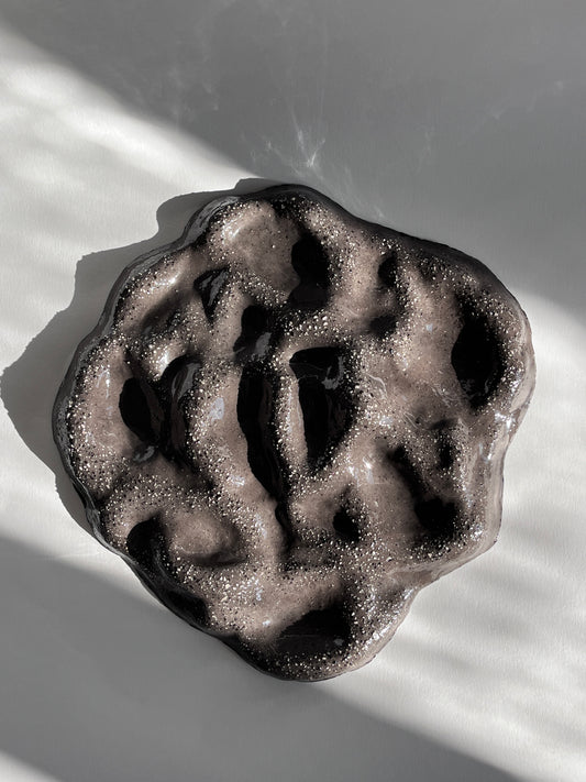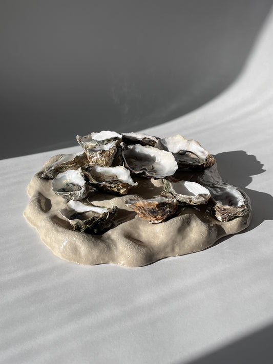 It is what it is: A serving plate for oysters, emulating a wet rock, evoking the intrigue and deep fascination of intricately shaped rock pools populated by small critters.